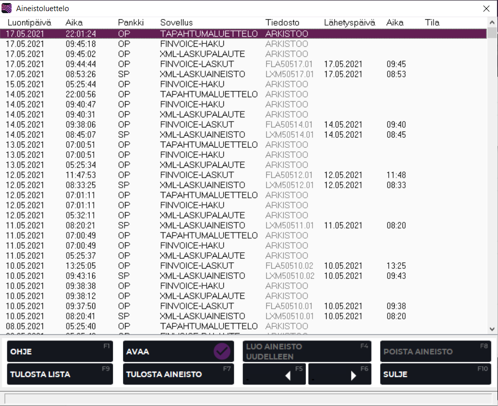 F4 Luo aineisto uudelleen | Luo valittuna olevan aineistoon uudelleen pankkiin lähetystä varten. Aineistoa ei voi luoda uudelleen mikäli tämä on yli 7 päivää vanha. Toimintoa ei tule käyttää, ellei ole aivan varma siitä että erä tulee muodostaa ja lähettää pankkiin uudelleen. |