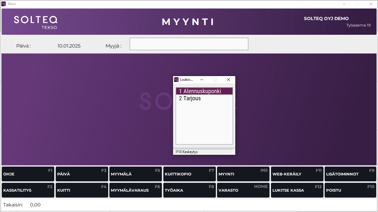 • Mikäli lisätoimintoihin ei ole määritetty alennuskupongin lisäksi muita toimintoja, ohjelma siirtyy F9 Lisätoiminnot -painikkeen painamisen jälkeen suoraan Alennuskuponki-tilaan.