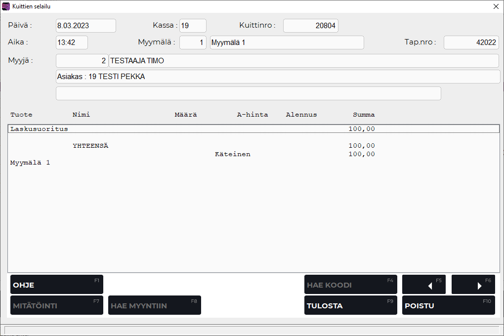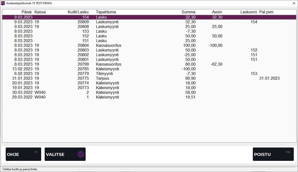 Ruudussa näkyvät asiakasnumerolle kirjaantuneet tapahtumat (ostot, laskut ja suoritukset) sekä niiden kuitti- tai laskunumerot. Voit avata yksittäisen tapahtuman tiedot Kuittien selailu-ruutuun painamalla Enter tai Valitse ✓ -painiketta.