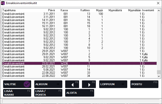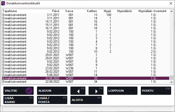 F3 Lisää / Poista | Lisää/poistaa listalta nuolinäppäimillä valitun kuitin osalta Inventointi Kyllä/Ei-valinnan. |