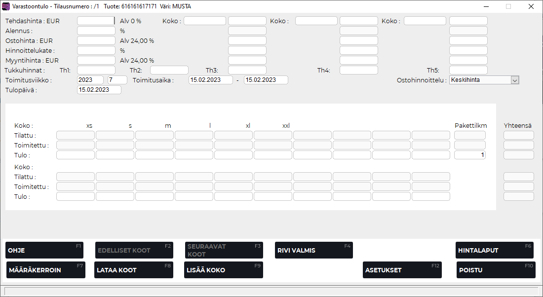 Voit hyödyntää Pakettilkm-kenttää kun olet antanut yhtä lajitelmaa koskien tuloutettavat kappaleet, ja haluat tilata useampia lajitelmia.Jos perustietoruudulla on valittu valuutaksi jokin muu kuin euro, niin tehdashinta tulee antaa kyseisessä valitussa valuutassa ja tällöin tulee huolehtia siitä, että valuutan kurssi on oikein perustiedoissa.