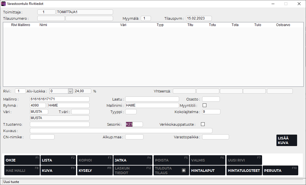 Syötä mallille tarvittaessa toimittajan tuotenumero (T.Tuotenro) ja Sesonki.