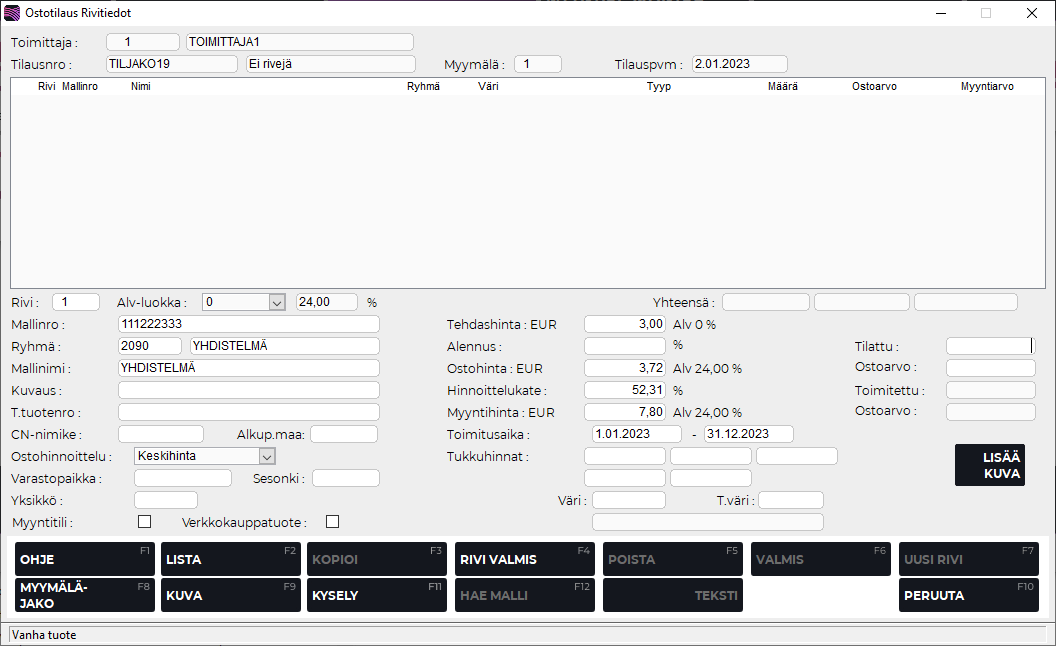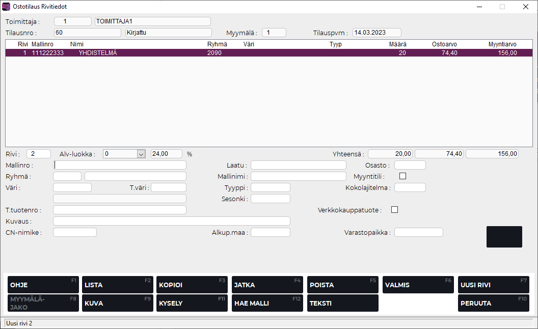 Kun olet antanut tarvittavat tiedot, jatka hyväksymällä rivi F4 Rivi valmis -painikkeella. Malli tulee näkyviin rivitietoihin.