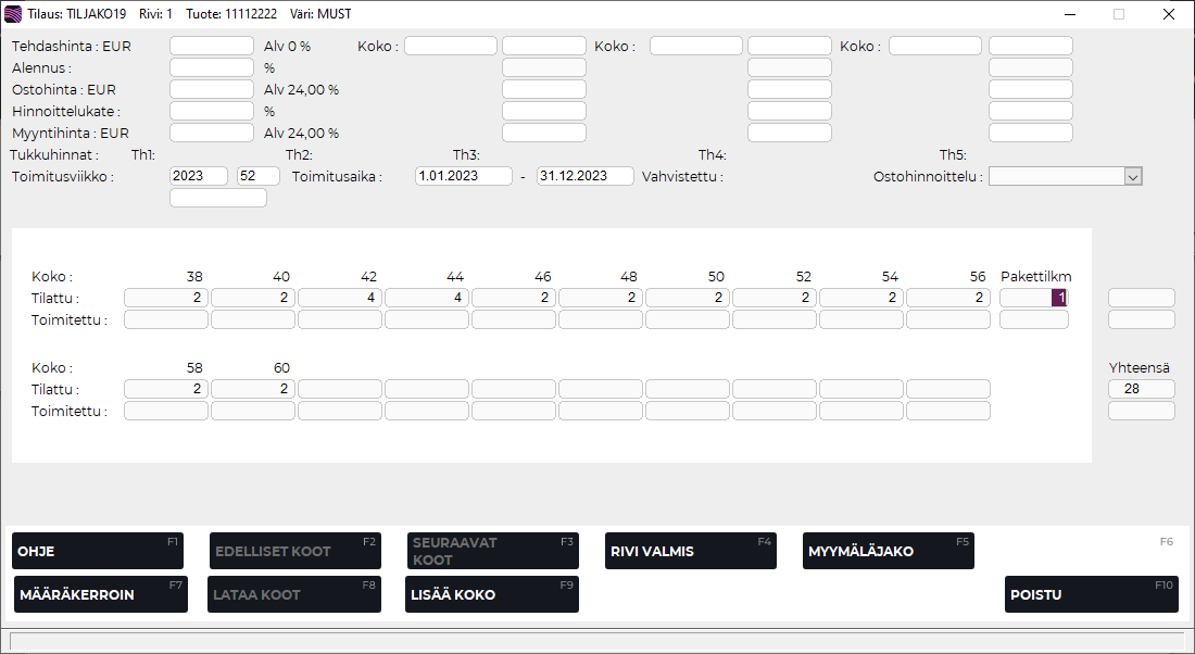 Kun mallille on annettu kokolajitelma, F4 Jatka avaa kokolajitelmaruudun, johon annetaan mallin hintatiedot ja tilatut määrät.