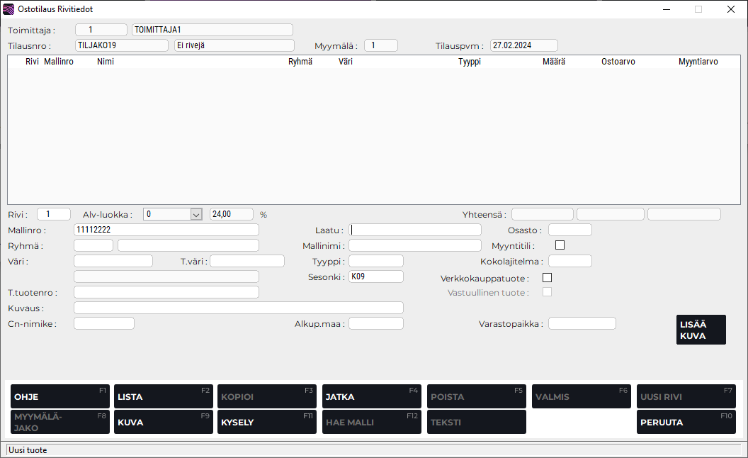 Ostotilauksen rivitietojen ensimmäinen näkymä perustettaessa uutta mallia, jolla käytetään väri- ja kokolajitelmaa