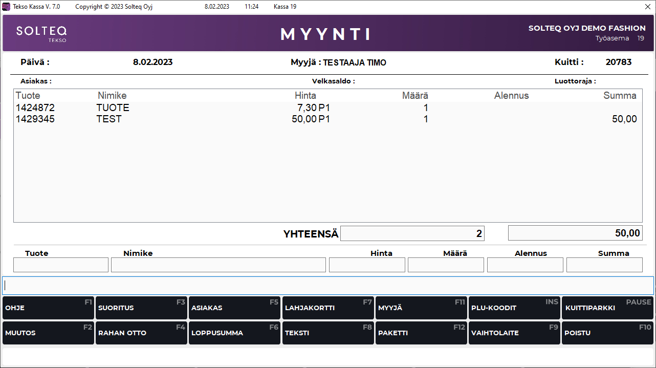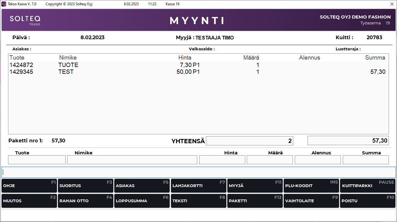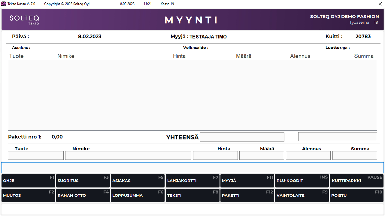Käytä F12 Paketti -myyntitoimintoa kun haluat myydä tietyn määrän tuotteita yhteishintaan. Pakettimyyntikuittiin tulostuvat paketin tuotteiden SH-hinnat, sekä tehdyn paketin pakettihinta.
