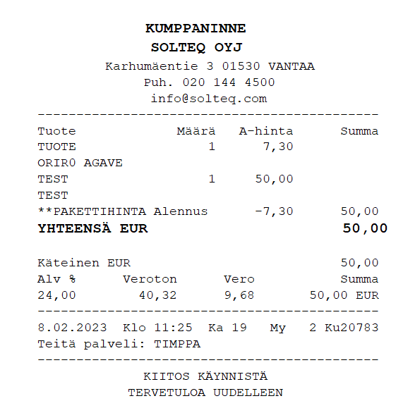 Paketin hinta näkyy tulostuvalla kuitilla.