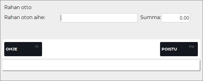 Käytä F4 Rahan otto -näppäintoimintoa kun nostat käteistä rahaa kassasta. Rahan otto kirjataan omalle kuitilleen.