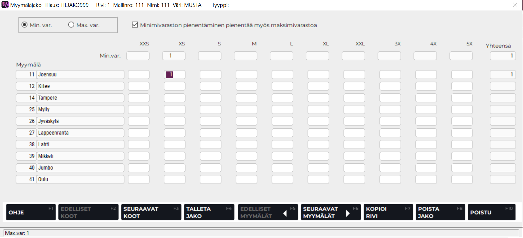 Syötä ensin minimimäärät (Min. var) kokokohtaisesti myymälöille.