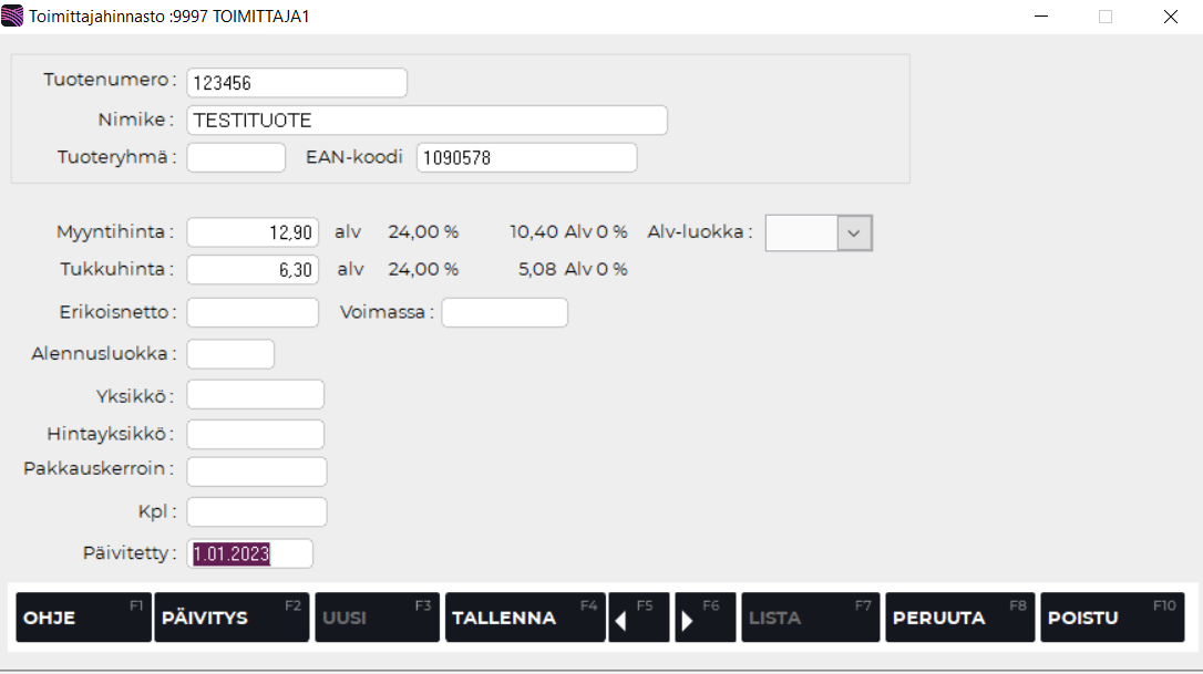 Toimittajan aiempi hinnasto avautuu, jos se on jo entuudestaan luotuna. Paina F2 Päivitys, jolloin toimittajahinnaston päivitysruutu avautuu.