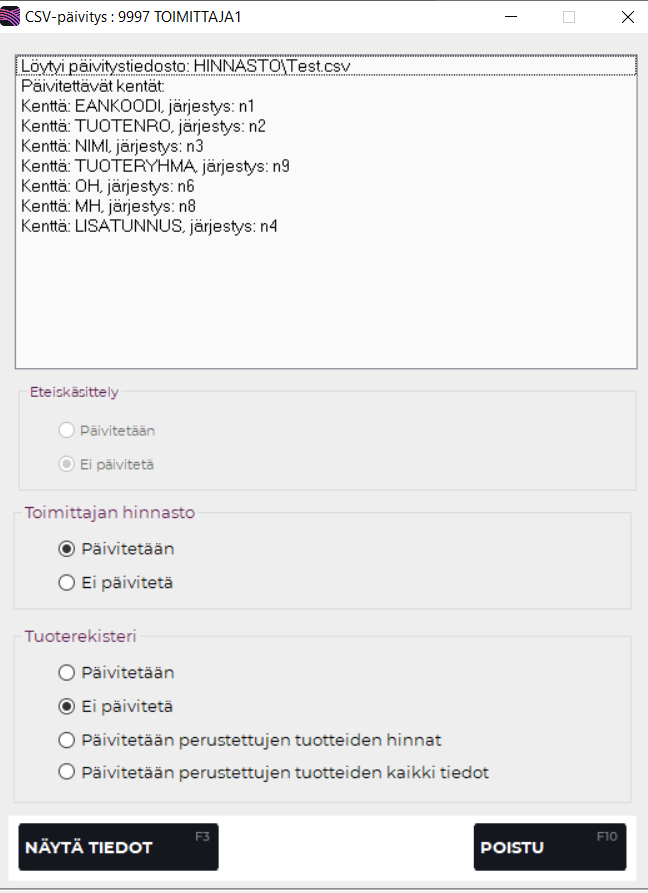 CSV-päivitys -ruutu