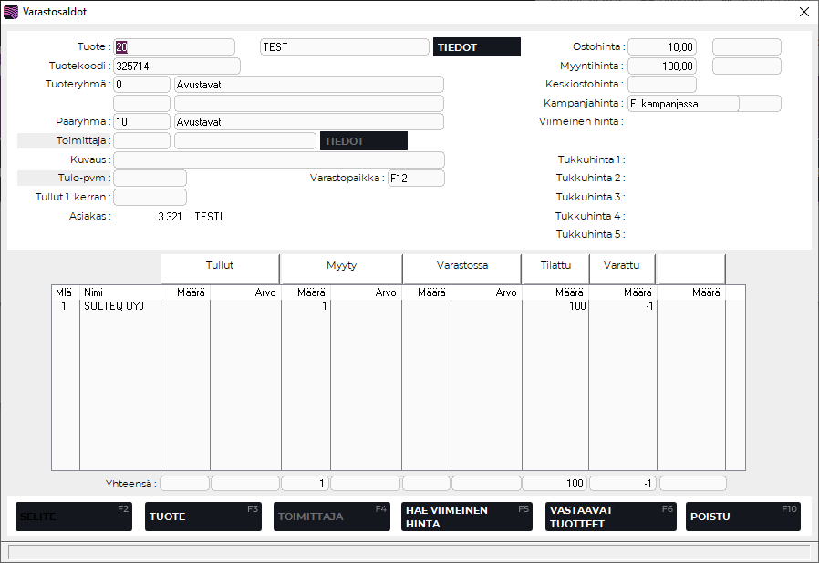 Voit hakea F8 Kysely -toiminnon avulla näkyviin viimeisen hinnan, jonka asiakas on tuotteesta maksanut: painike avaa Varastosaldot-ruudun, joka sisältää F5 Hae viimeinen hinta-painikkeen, jota painamalla ohjelma hakee asiakkaan viimeisen hinnan ja näyttää sen ruudun yläosassa.