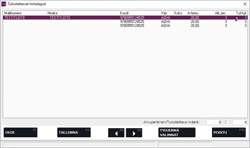 Ennen tulostamista voit myös vielä muokata tulostettavien lappujen määrää painamalla Valitse tulostettavat hintalaput; painike avaa Tulostettavat hintalaput-ruudun, jossa voit muuttaa kappalemäärän niille lapuille joita varastoontulon perusteella on tulostumassa. Toiminnolla voidaan muuttaa tulosteiden määrää per tuotekoodi. Paina Tallenna ja Poistu, kun olet tehnyt tarvittavat muutokset.