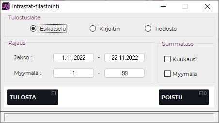 Valitsemalla tulostuslaitteeksi Tiedosto ja sen jälkeen painamalla F1 Tulosta voit luoda tiedostomuotoisen raportin Tekson Intrastat.-alihakemistoon.