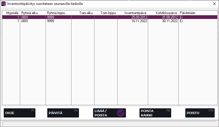 Jotta inventoitu tilanne saadaan näkyviin Tekson varastosaldoihin, tulee inventointi päivittää sen jälkeen kun sen tulos on todettu oikeaksi. Inventoinnin päivitys-ruudulle tulevat näkyviin kaikki päivittämättömät inventoinnit, joten kannattaa tarkastaa että ohjelma ehdottaa oikeaa inventointiaikaa päivitettäväksi. Jos kyseessä on monimyymäläympäristö, voit muuttaa Lisää/poista-painikkeella Päivitetään-tietoa, mikäli kaikkien myymälöiden inventaaria ei haluta päivittää samalla kertaa.