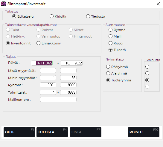 Inventoinnin siirtoraportti antaa listauksen inventointitapahtumien selailussa näkyvistä kuiteista. Summatasoksi voidaan valita ryhmä, malli/tuote, koodi tai tuloerä (=kuiteittain).