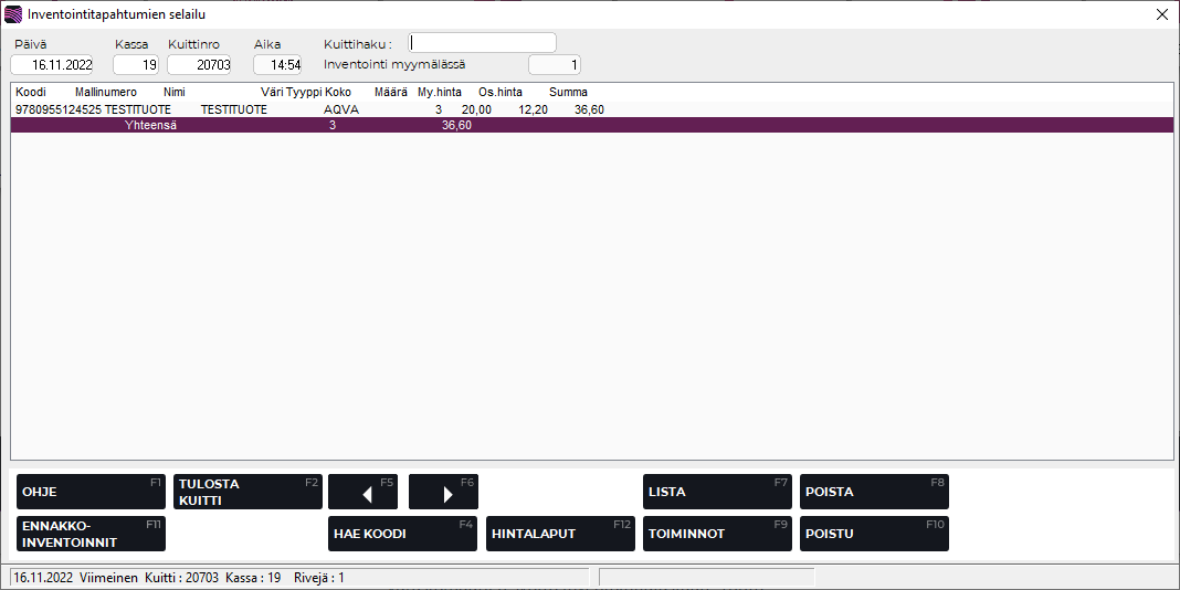 Tarvittaessa voit hakea inventointikuiteilta tuotteita F4 Hae koodi -toiminnolla. Tällöin näkyvissä täytyy olla ensimmäinen kuitti, josta haun halutaan lähtevän liikkeelle. Syötä avautuvaan hakuruutuun koodi, ja paina sitten Hae. Ohjelma hakee ruudulle ensimmäisen kuitin, josta kyseinen koodi löytyy. Seuraava kyseisen koodin sisältävä kuitti saadaan haettuna valitsemalla uudestaan Hae koodi. Mikäli ohjelma ei löydä koodia, tulee siitä ilmoitus ruudun alareunaan.