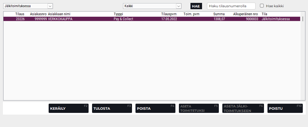 Jälkitoimitustilaus ei näy ponnahdusikkuna-ilmoituksena, vaan se haetaan käsittelyyn keräilytoiminnon kautta manuaalisesti sitten kun puuttuva tavara on toimitettavissa. Tilauslistaan pääset joko