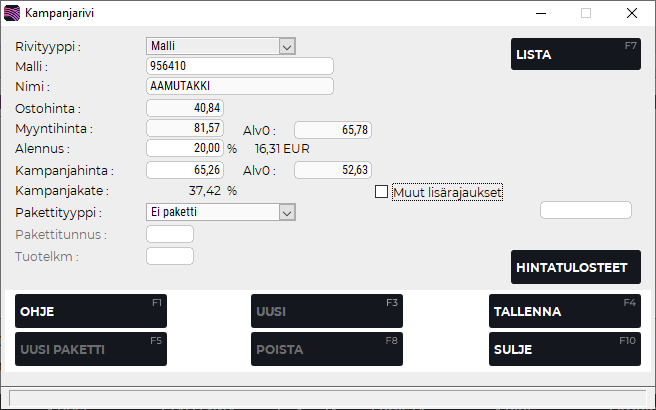F8 Poista | Poistaa kyseisen rivin kampanjasta tai hinnastosta. |