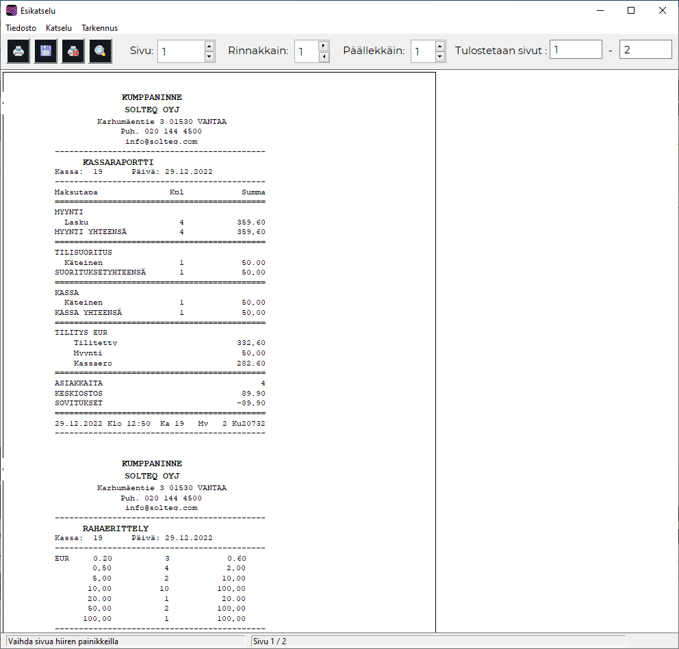 Tämän jälkeen kassaraportti sekä rahaerittely tulostuvat kuittikirjoittimesta.