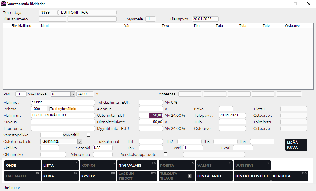 Luo varastoontulo esim. yleistoimittajalle; valitse koodaustavaksi Automaattinen.