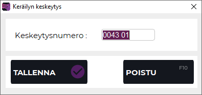 Voit tarvittaessa keskeyttää ja tallentaa keräilyn myöhempää käsittelyä varten painamalla F10 Poistu/Tallenna. Kun tilaukselle on tehty muutoksia, avautuu Keräilyn keskeytys -ruutu; valitse Tallenna, jos haluat tallentaa jo tehdyn keräilyn. Ohjelma tallentaa keräilyn automaattisesti määräytyvälle ensimmäiselle vapaalle keskeytysnumerolle.