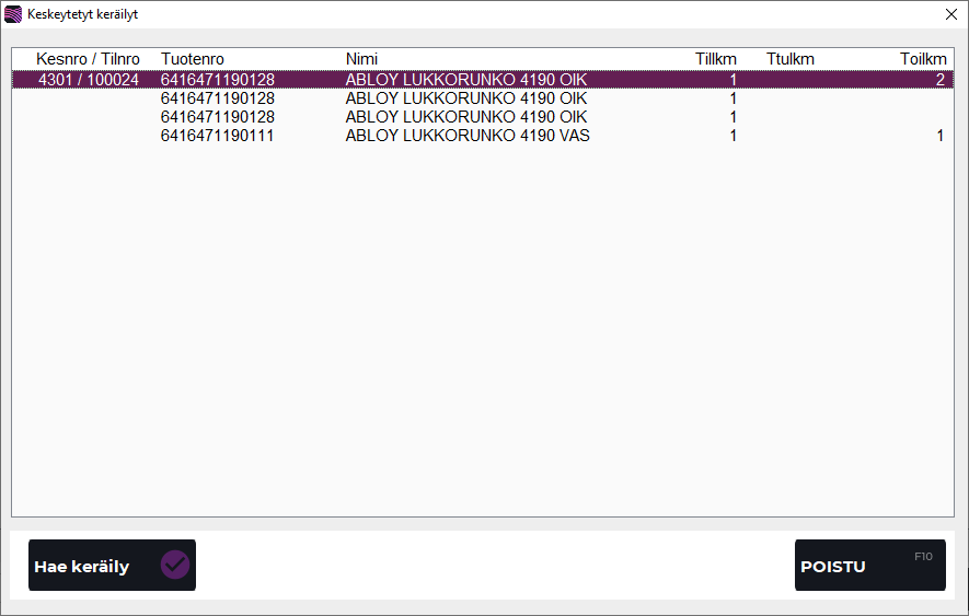 Voit myös poistua tallentamatta keräilyä painamalla Keräilyn keskeytys -ruudulla F10 Poistu; tällöin keräilyssä tehdyt muutokset perutaan. Muutokset on mahdollista perua niin kauan kun keräilyä ei ole laskutettu; esimerkiksi kun keräily on haettu tallennetuista ja poistuttu tallentamatta, voidaan tilaus hakea taas alkuperäisin tiedoin tilauksista.