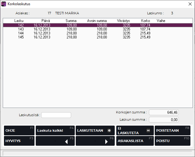 Mikäli haluat peruuttaa Laskutetaan-valinnan, voit tehdä sen Ei laskuteta -painikkeella. F8 Poistetaan -toiminto poistaa laskun korkolaskutuksesta, mutta ei itse alkuperäistä laskua. Kun halutut laskut on valittu, tallenna valinta F4 Tallenna -painikkeella, jolloin ohjelma siirtyy seuraavaan asiakkaaseen.