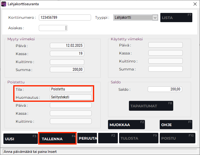 Lahjakortin Tila-kenttään tulee näkyviin teksti Poistettu. Syötä Huomautus-kenttään selitysteksti, ja paina sitten F4 Tallenna.