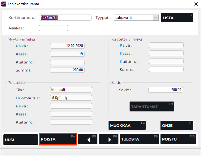 Hae poistettava lahjakortti Lahjakorttiseuranta-ruudulle, ja paina sitten F4 Poista.