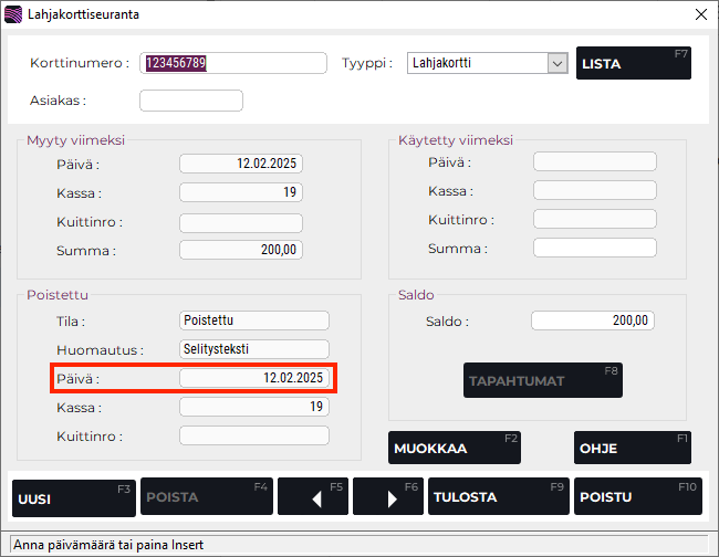 Lahjakortti on nyt poistettu, ja Päivä-kenttään tulee näkyviin lahjakortin poiston päivämäärä.
