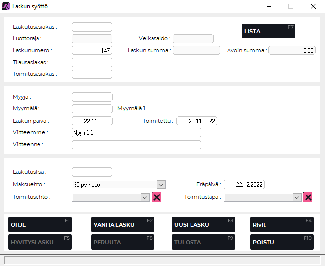 F9 Tulosta | Painikkeella tulostetaan ruudulla oleva lasku. Lasku tulostuu kun Laskun syöttö -toiminnosta poistutaan. |