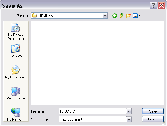 Tee tallennus Tekso-kansion alla olevaan mdlinkki-kansioon (C:\TEKSO\MDLINKKI), tai siirrä tiedosto sinne tallennuksen jälkeen.