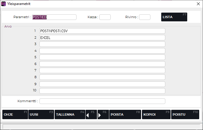 Mikäli listaus halutaan CSV-muotoisena, tulee yleisparametreissa olla perustettuna parametri POSTIED, jonka ensimmäisellä rivillä määritetään polku ja tiedostonimi, johon listaus tulostetaan. Toisella rivillä on teksti EXCEL. Ota tarvittaessa yhteyttä Solteqin asiakastukeen parametrin määrittämiseksi.