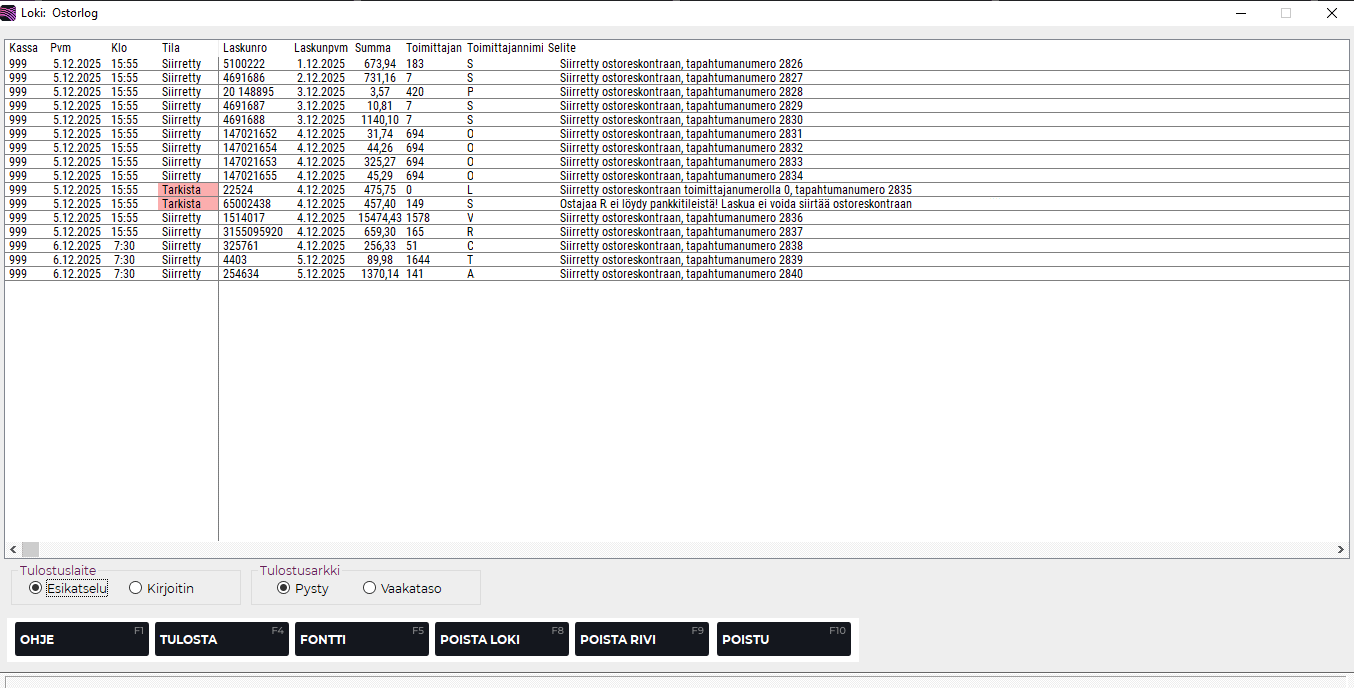 Ostoreskontran Loki-toiminnolla voit tarkastella raporttia siirretyistä laskuista ja mahdollisista virheistä.