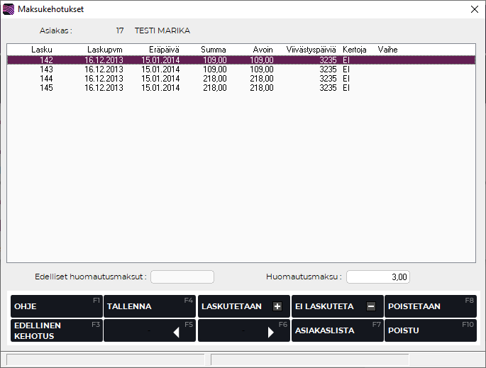Kun halutut laskut on valittu, tallenna valinta F4 Tallenna -painikkeella, jolloin ohjelma siirtyy seuraavaan asiakkaaseen.