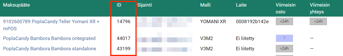 Maksupäätteiden tunnukset ovat listattuina ID-sarakkeessa.