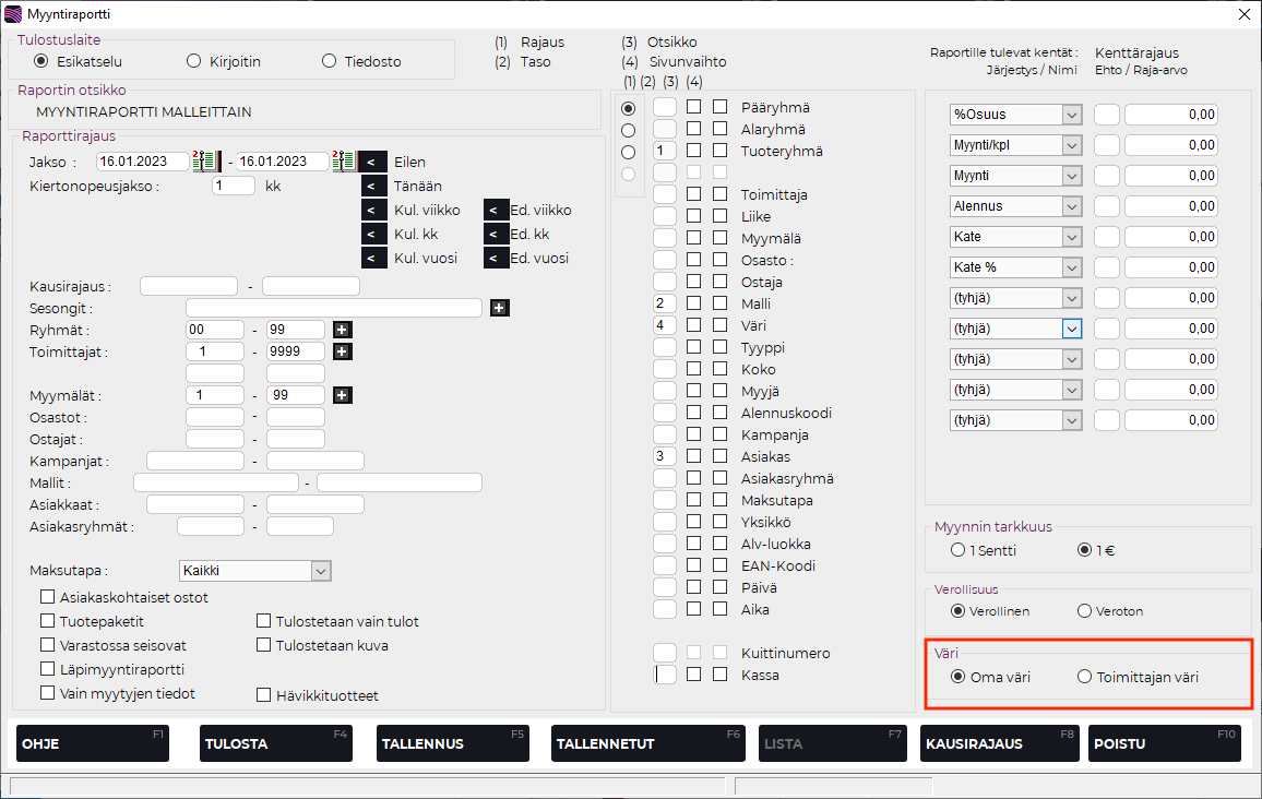 Myyntiraportti-ruutu, jossa Oma väri/Toimittajan väri -valinta