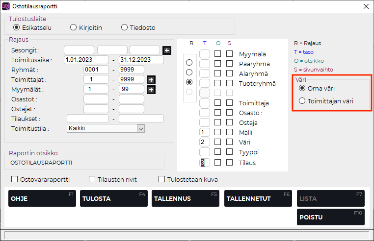 Ostotilausraportti-ruutu, jossa Oma väri/Toimittajan väri -valinta