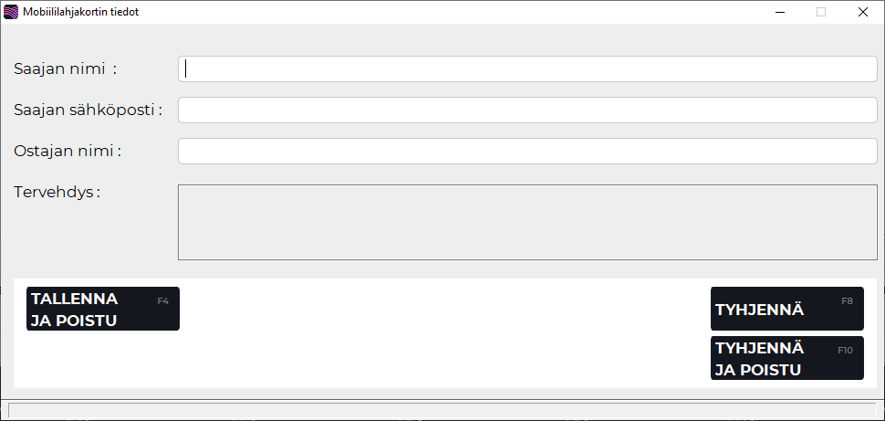 Paina Lahjakortti-ruudulla F2 Mobiililahjakortti-painiketta. Mobiililahjakortti-ruutu avautuu.