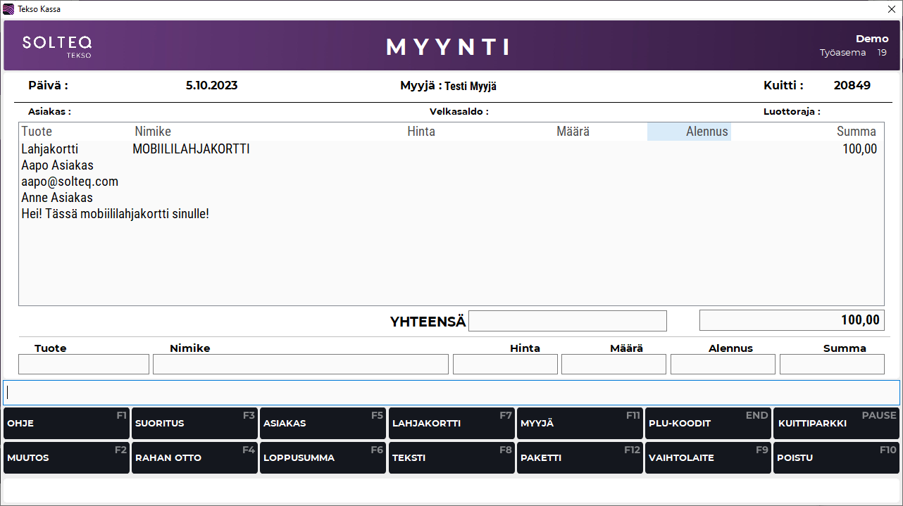 Paina F4 Tallenna ja poistu, jolloin palaat Lahjakortti-ruudulle.