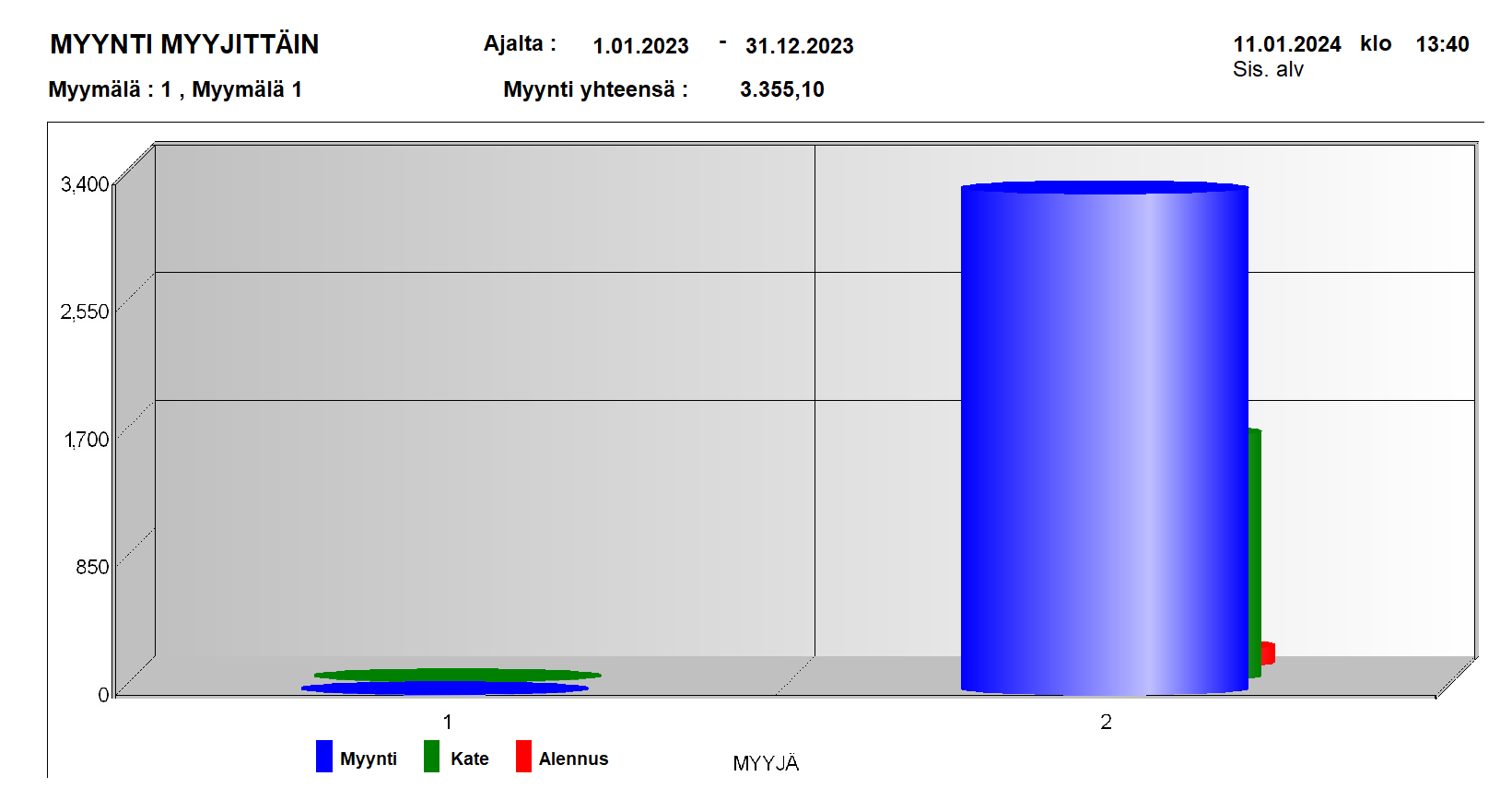 Rajattaessa raportti esimerkiksi myymälöihin 1-4, ensimmäisellä sivulla on vain myymälän 1 myynnit myyjittäin. Kaikkien myymälöiden myynnit myyjittäin eivät toistaiseksi tulostu yhdelle sivulle, vaan kukin myymälä tulostuu omille sivuilleen.