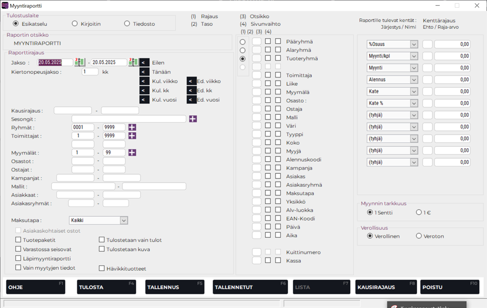 Voit määrittää myyntiraportille tulevat rajaus-, taso-, otsikko- ja sivunvaihtotiedot halutun laisiksi.