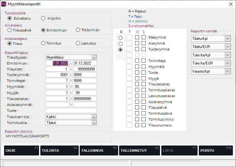 Myyntitilausraportin funktionäppäimet