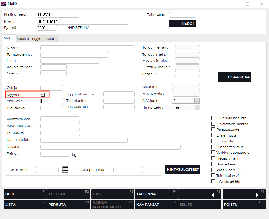 Mallille voidaan lisätä myyntitilitieto myös sen perustiedoissa: klikkaa Myyntitili-valintaruutu aktiiviseksi, ja tallenna tiedot painamalla F4 Tallenna.