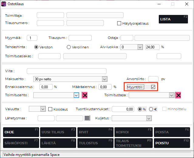 Voit määrittää koko tilauksen ja tuloutuksen myyntitilituotteiksi valitsemalla ennen ostotilauksen tai varastoontulon syöttämistä Myyntitili-valintaruudun aktiiviseksi perusruudulla.