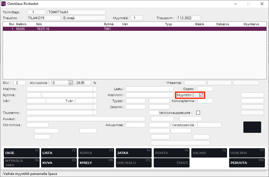 Myyntitili-merkintä ostotilauksen rivitiedoissa (koko- ja värilajitelma käytössä)