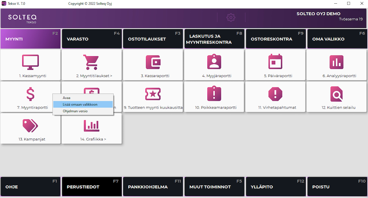 Kun avaat oman valikon F6 Oma valikko-painikkeella, niin kyseinen Kassaraportti -toiminto on tallentuneena listalla.