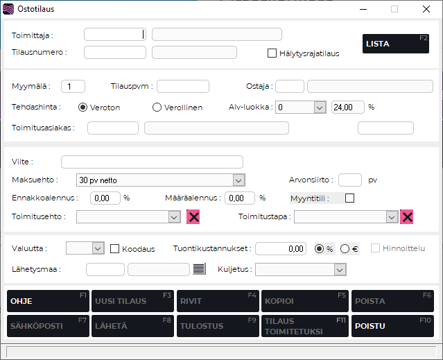 F3 Uusi tilaus | Tekee uuden tilauksen ja antaa tilaukselle seuraavan vapaan tilausnumeron. Painike aktivoituu kun toimittajanumero on annettu. |