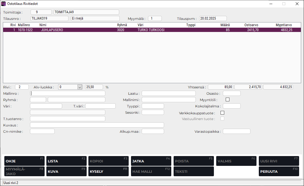 F3 Kopioi | Kopioi halutun rivin, jolloin saman tuotteen tiedot saadaan hintoineen ja tilausmäärineen automaattisesti seuraavalle riville jonka jälkeen niitä voidaan tarvittaessa muokata (esimerkiksi voidaan perustaa toinen väri). Painikkeen takaa aukeaa ruutu, jossa määritetään kopioitavan rivin numero. |